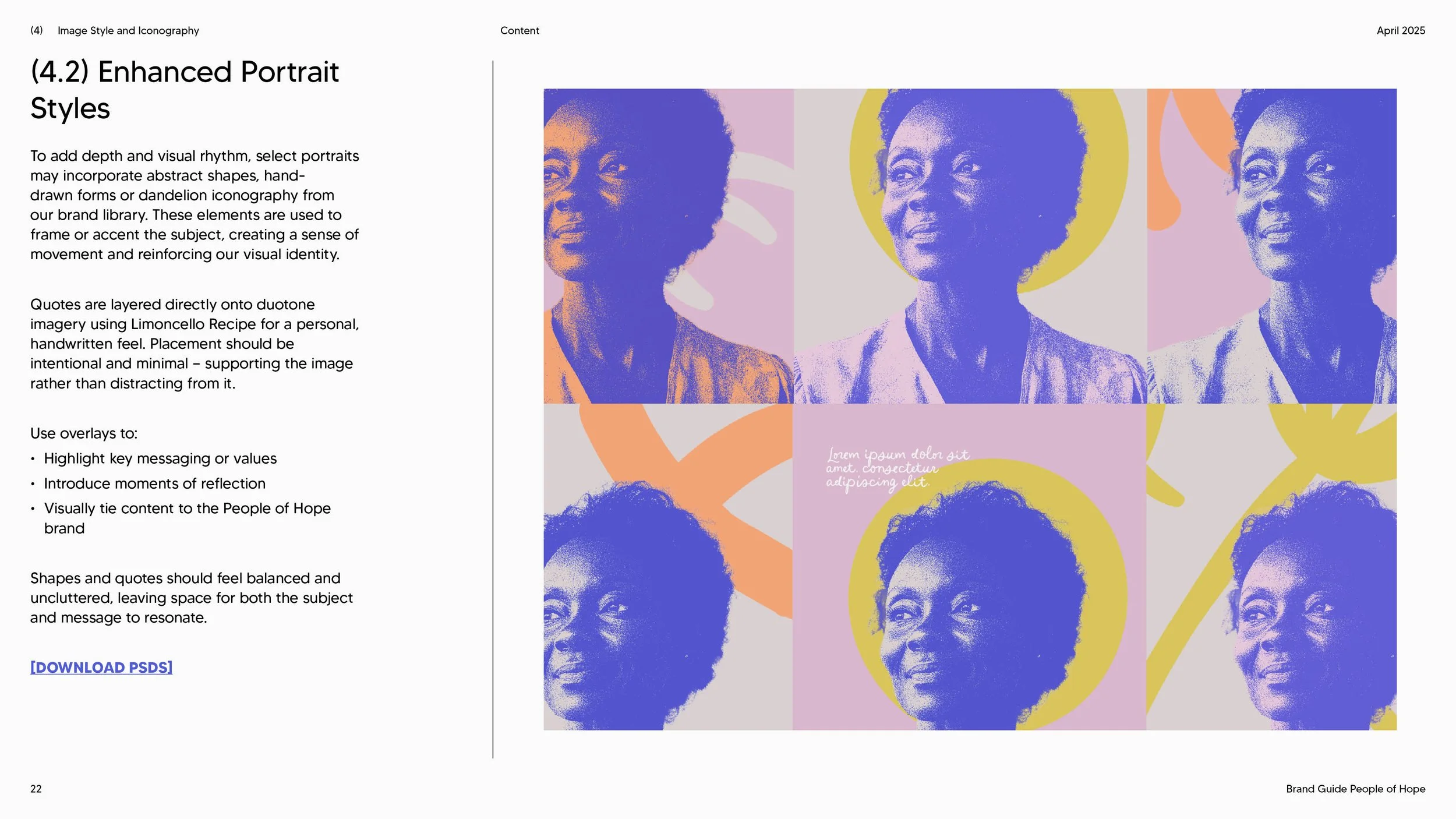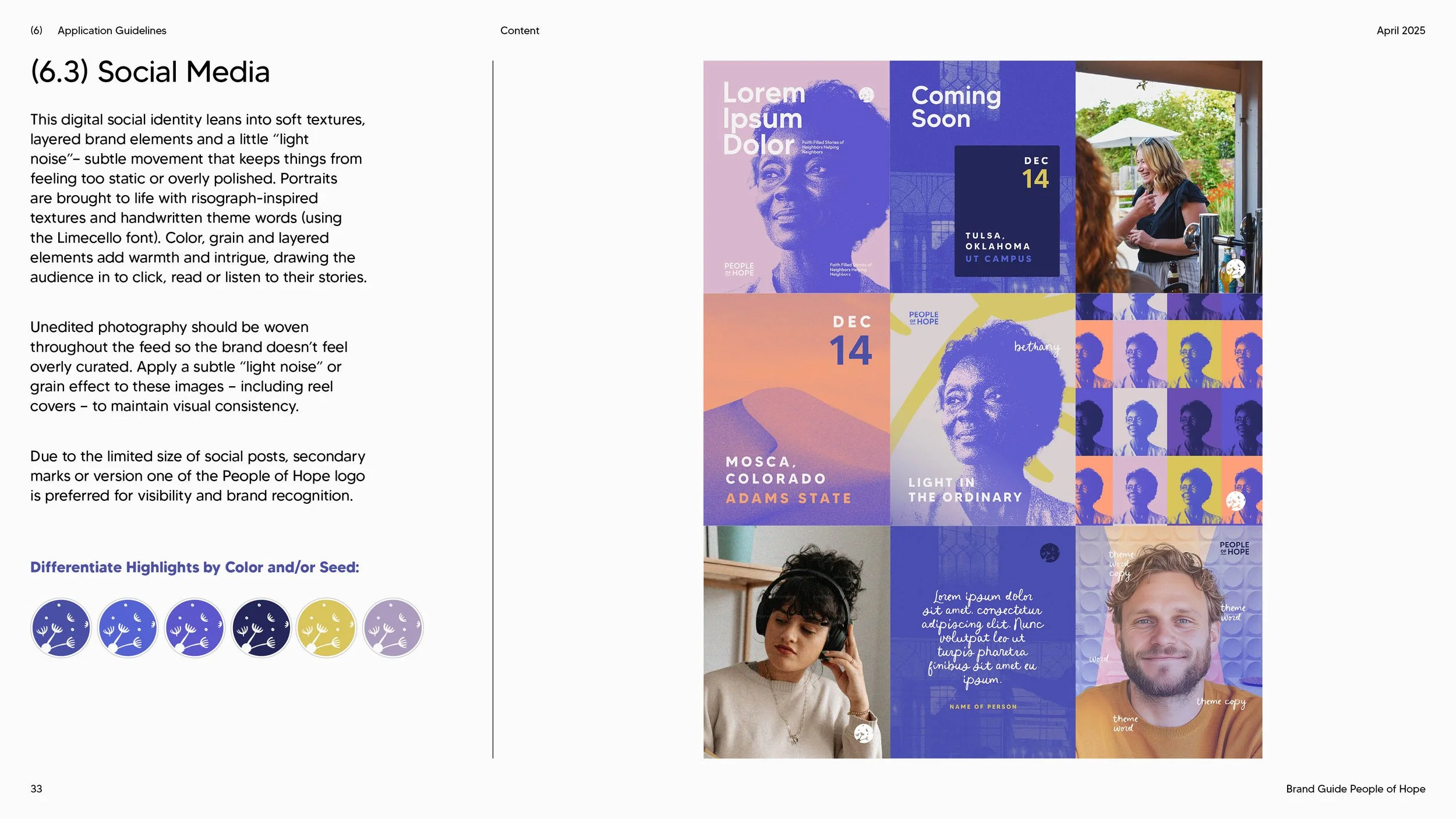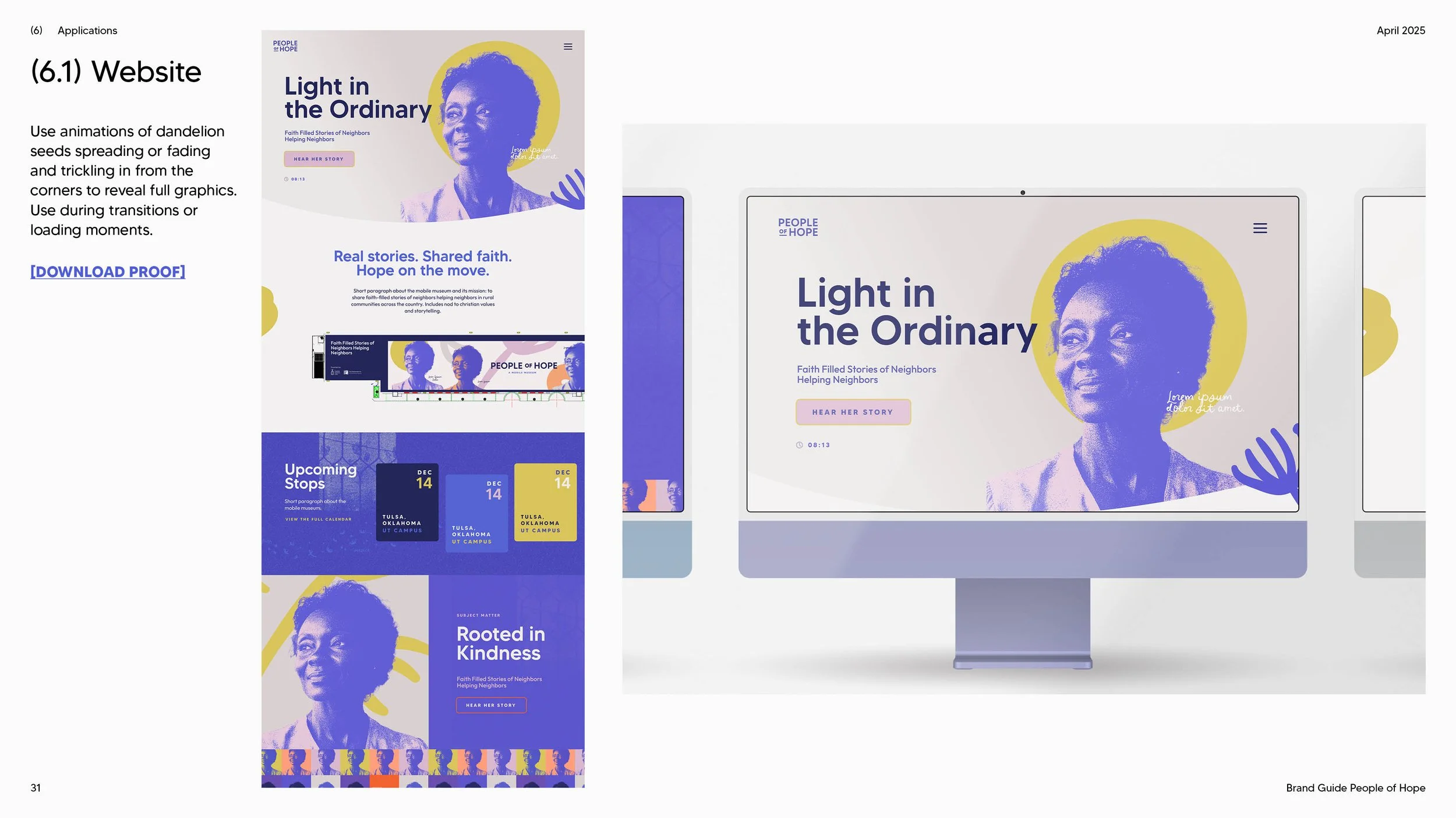 The visual identity I developed for People of Hope combines bold purples, soft pastels, and warm accents to bring both flexibility and energy to the brand. Portraits are layered with duotone or gradient overlays—most often in our signature purple or deep blue—adding emotional depth, consistency, and visual richness to every story. To introduce rhythm and movement, select images incorporate abstract shapes, hand-drawn forms, and dandelion-inspired motifs drawn from the brand library. The dandelion serves as the heart of the identity: each seed, playful circle, and cross-stroke symbolizes scattering, connection, and the spread of hope. Together, these elements create a cohesive system—applied across the logo, typography, website, and even a full-truck wrap—that reinforces the project’s mission to share stories of faith, mercy, and service nationwide.